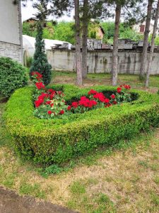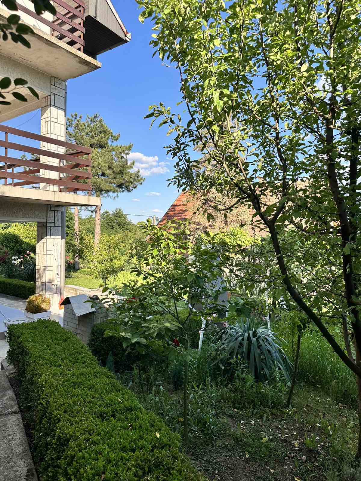 В саду плодоносят фруктовые деревья: яблони, груши, черешня, вишня, слива, имеется небольшой виноградник, высажены цветы. Во дворе установлен новый гриль для барбекю.